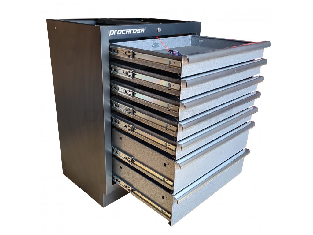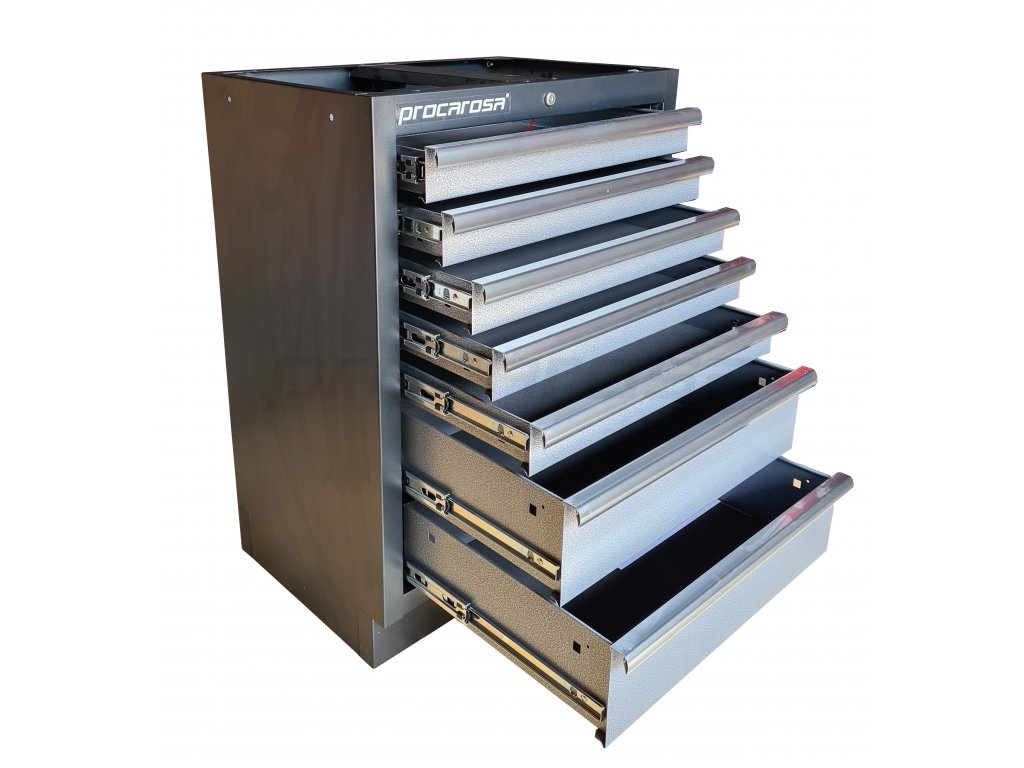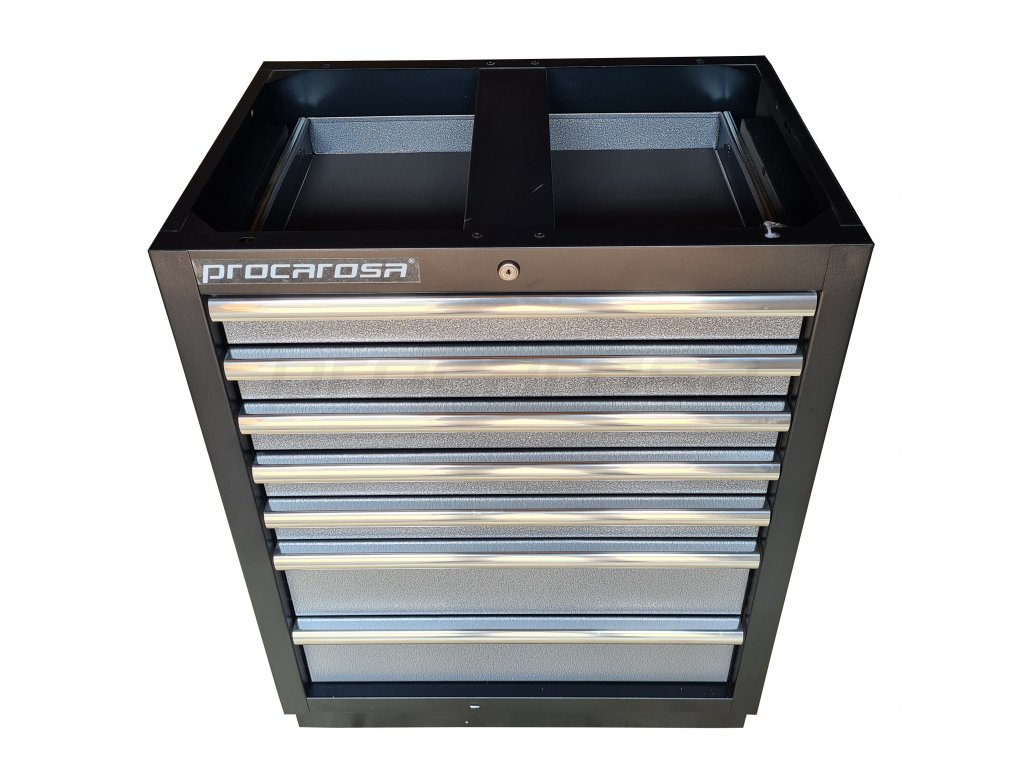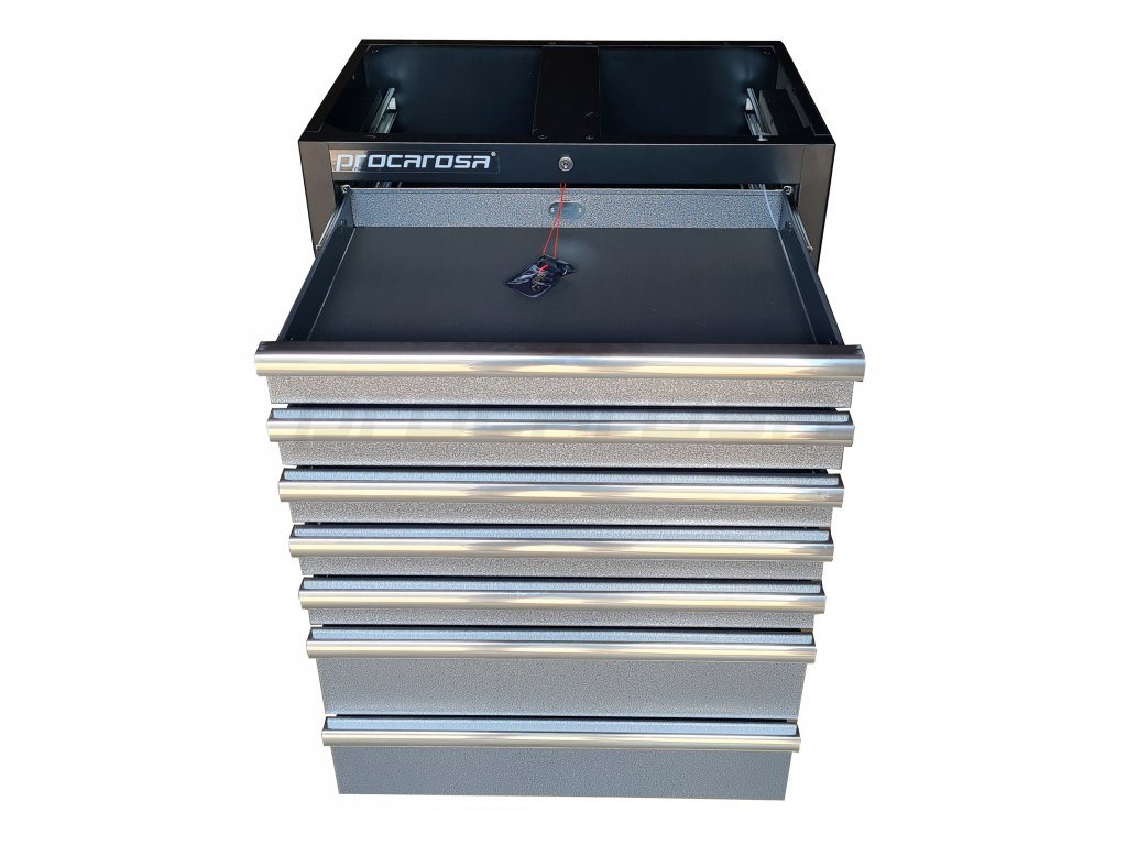 Celokovová uzamykateľná skrinka Procarosa PROFI TGC-1307 so siedmimi zásuvkami na guličkových ložiskách. Zásuvky sú vybavené protišmykovou penovou podložkou pohlcujúcou zvuk.
