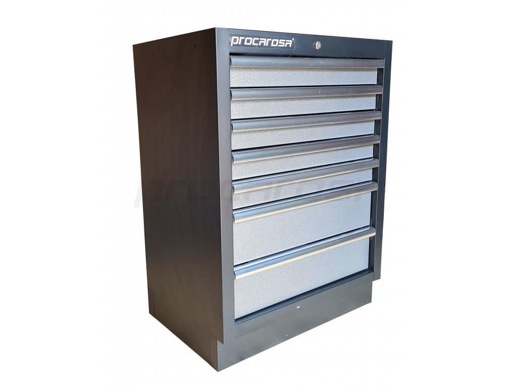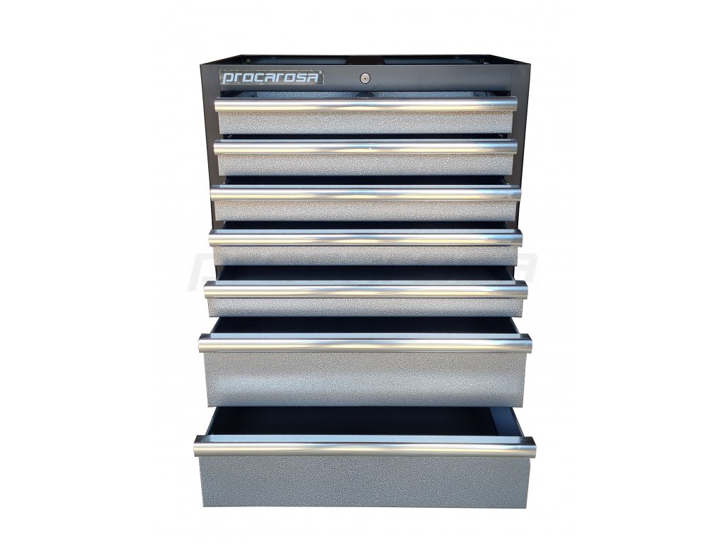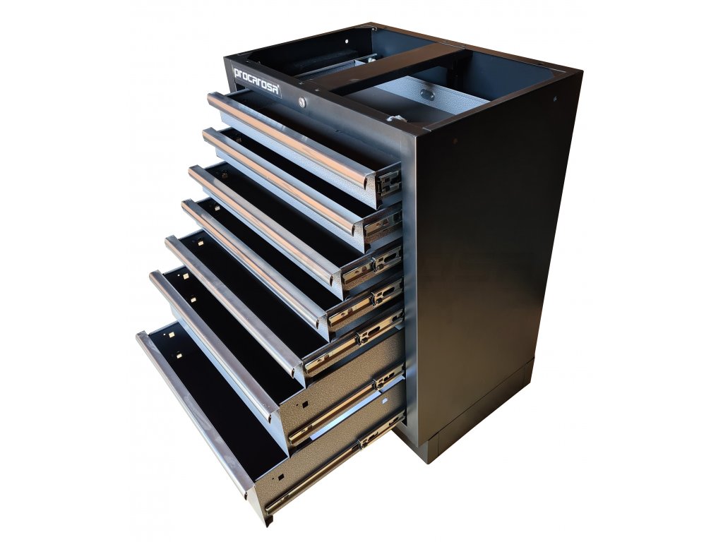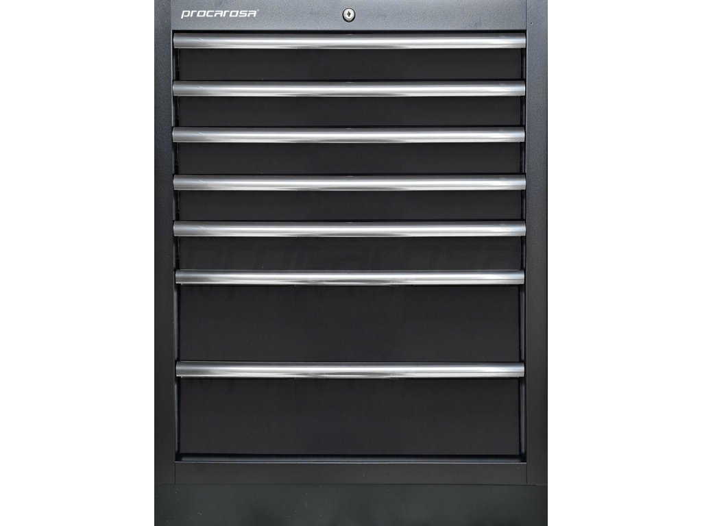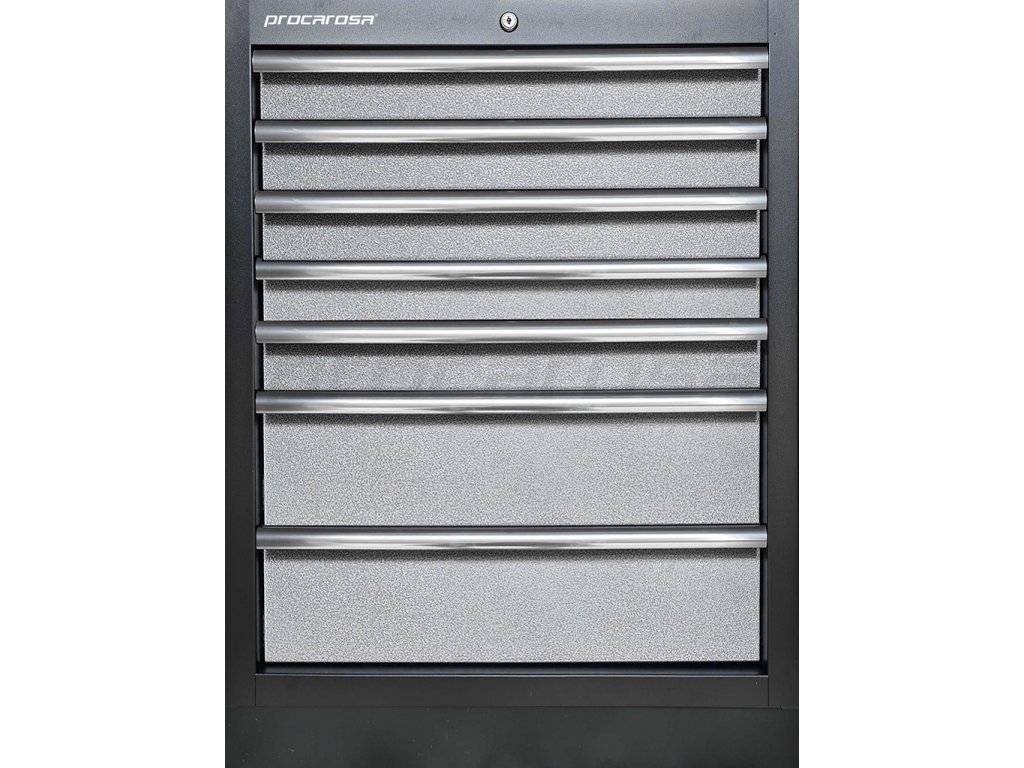Celokovová uzamykateľná skrinka Procarosa PROFI TGC-1307 so siedmimi zásuvkami na guličkových ložiskách. Zásuvky sú vybavené protišmykovou penovou podložkou pohlcujúcou zvuk.