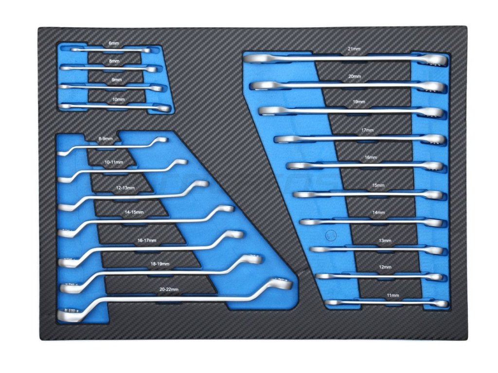 14 x očkoplochý kľúč: 6 – 8 – 9 – 10 – 11 – 12 – 13 – 14 – 15 – 16 – 17 – 19 – 20 – 21 mm