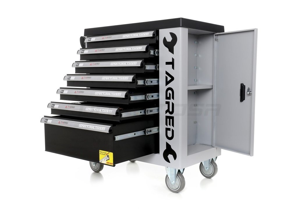 Dielenský box TAGRED vhodný do autoservisov, dielní a pod., je vybavený často používaným náradím pri práci v prevádzke. Vďaka vozíku ste schopní ľahko udržiavať poriadok na pracovisku a zároveň chránite nástroje pred krádežou. Zásuvky sú centrálne uzamykateľné, bočná skrinka sa zamyká zvlášť. Kľúče sú dodávané s vozíkom.