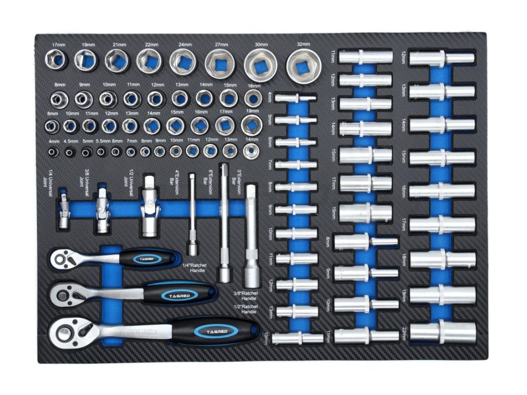 17 x nástrčná hlavica 6 hranová: 8 – 9 – 10 – 11 – 12 – 13 – 14 – 15 – 16 – 17 – 19 – 21 – 22 – 24 – 27 – 30 – 32 mm13 x nástrčná hlavica 6 hranná predĺžená: 8 – 9 – 10 – 11 – 12 – 13 – 14 – 15 – 16 – 17 – 18 – 19 – 20 mmračňa s prepínaním vľavo/vpravo, 72 zubov, dĺžka 250 mmuniverzálny kĺb – kardanpredĺženie 125 mm2. zásuvka