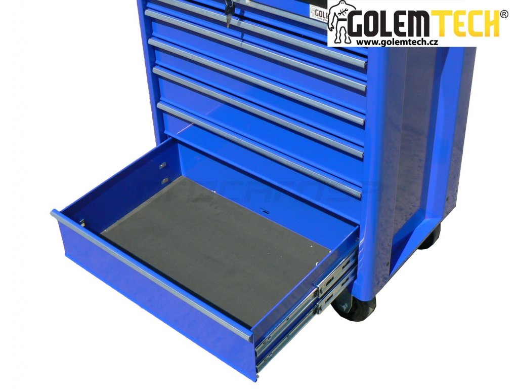 Mobilný uzamykateľný box na náradie so siedmimi zásuvkami. Dve otočné a dve pevné kolieska s brzdou. 7 zásuviek s valcovými ložiskami.