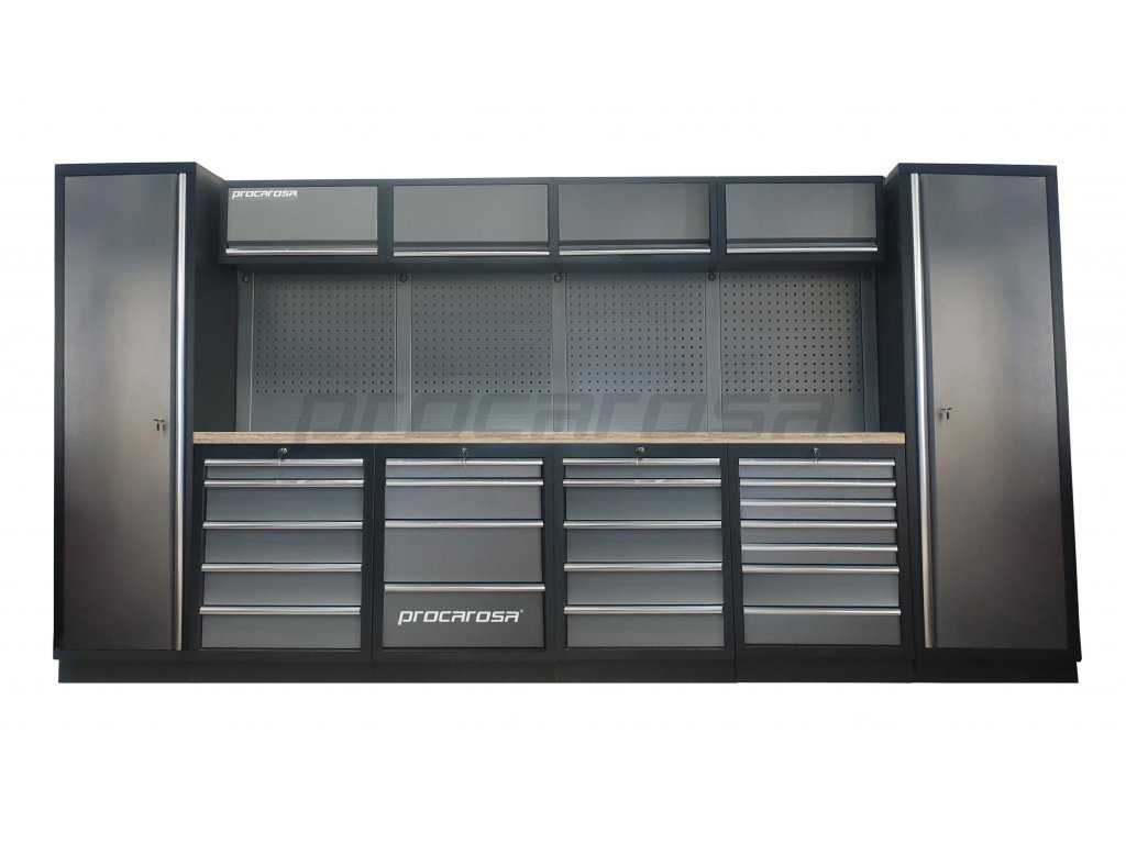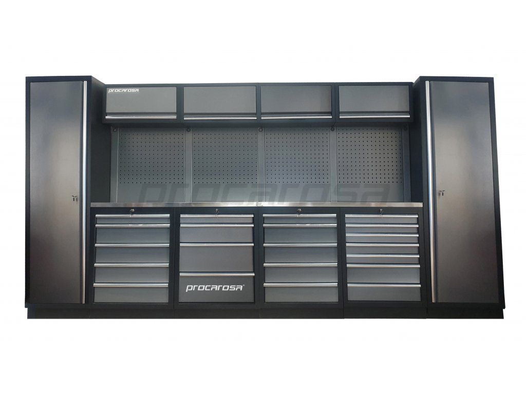 Zostava dielenského nábytku Procarosa PROFI PROFESSIONAL L-8, vhodná ako do profesionálnych dielní a servisov, tak aj do garáží na uskladnenie ručného náradia, nástrojov, materiálov, vybraných súčiastok, dokumentácie a mnoho ďalších vecí, ktoré vo Vašom priestore potrebujete uskladniť.